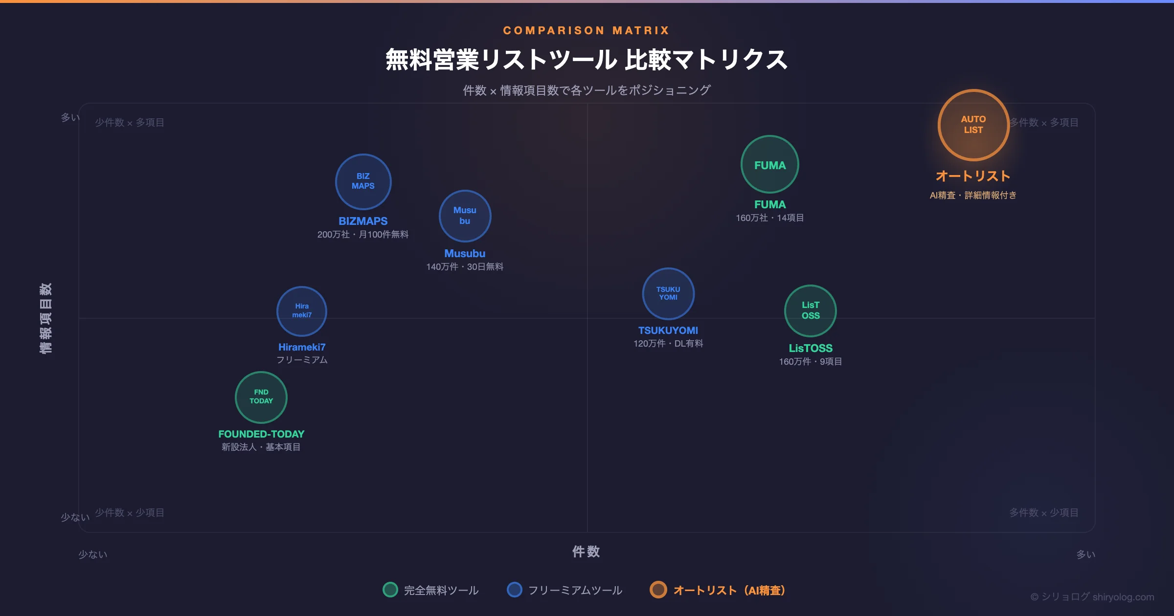 - 完全無料ツール: FUMA(160万社・14項目・CSV有料)、LisTOSS(160万件・9項目・CSV無料無制限)、FOUNDED-TODAY(新設法人特化)