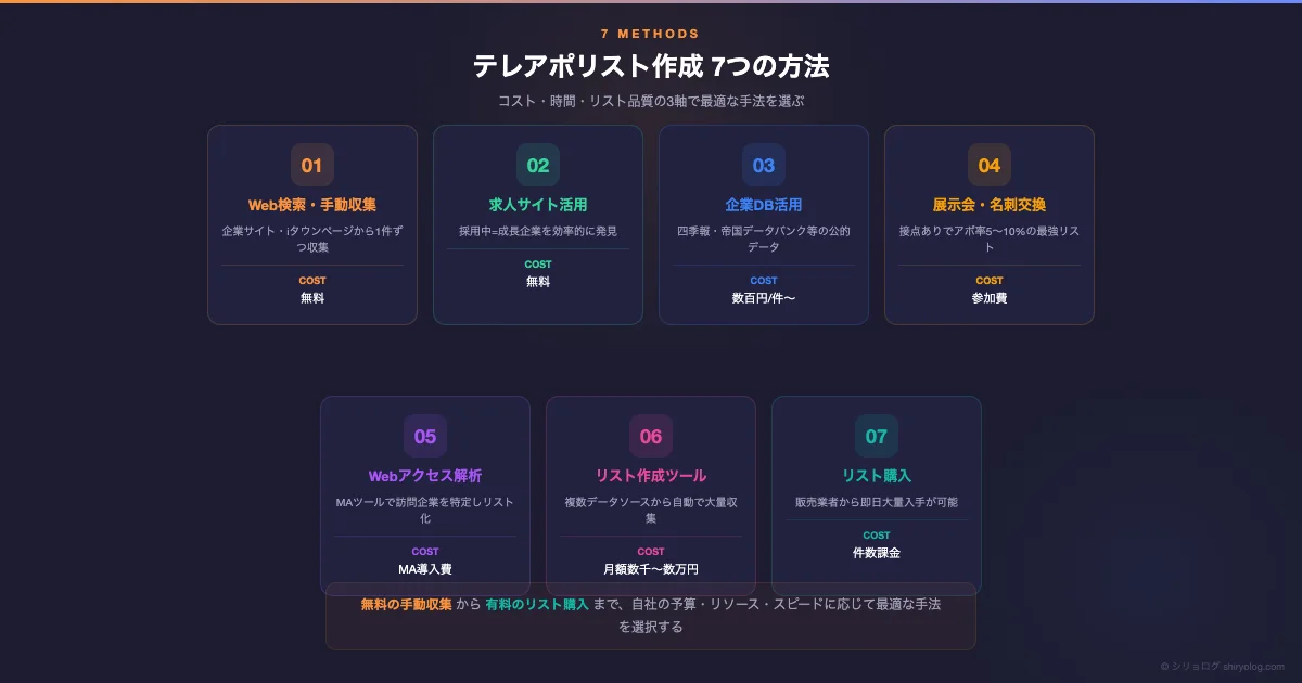 テレアポリストの作成方法は大きく7つに分類できる。それぞれコスト・所要時間・リストの質が異なるため、自社の状況に合った方法を選ぶことが重要だ。